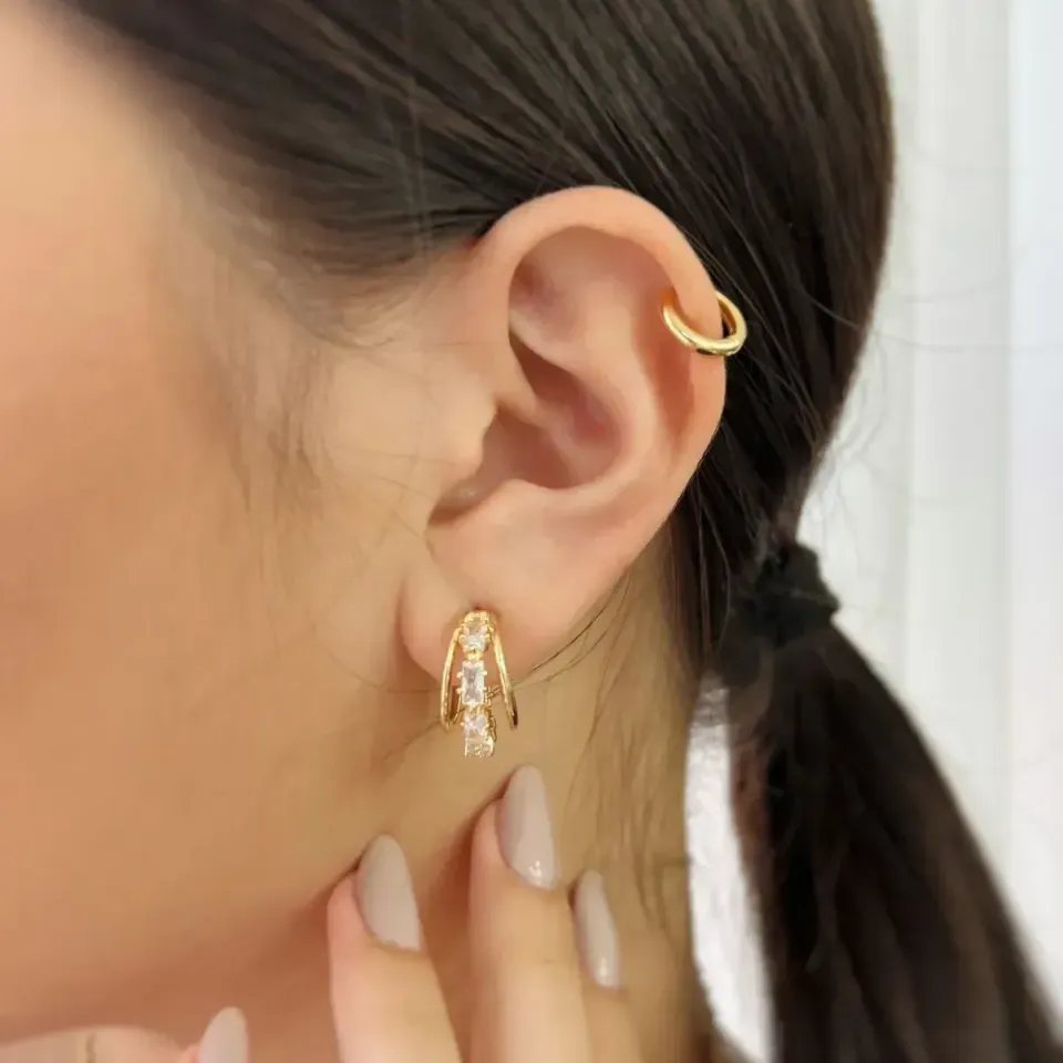 Argola tripla com fio de zircônias navete. banhado a ouro 18k.