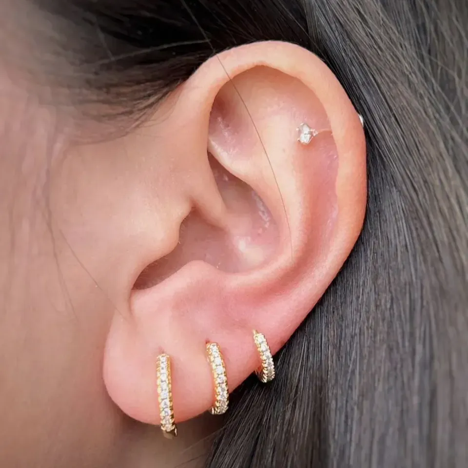 Brinco argola cravejada. fecho click. banhado a ouro 18k.