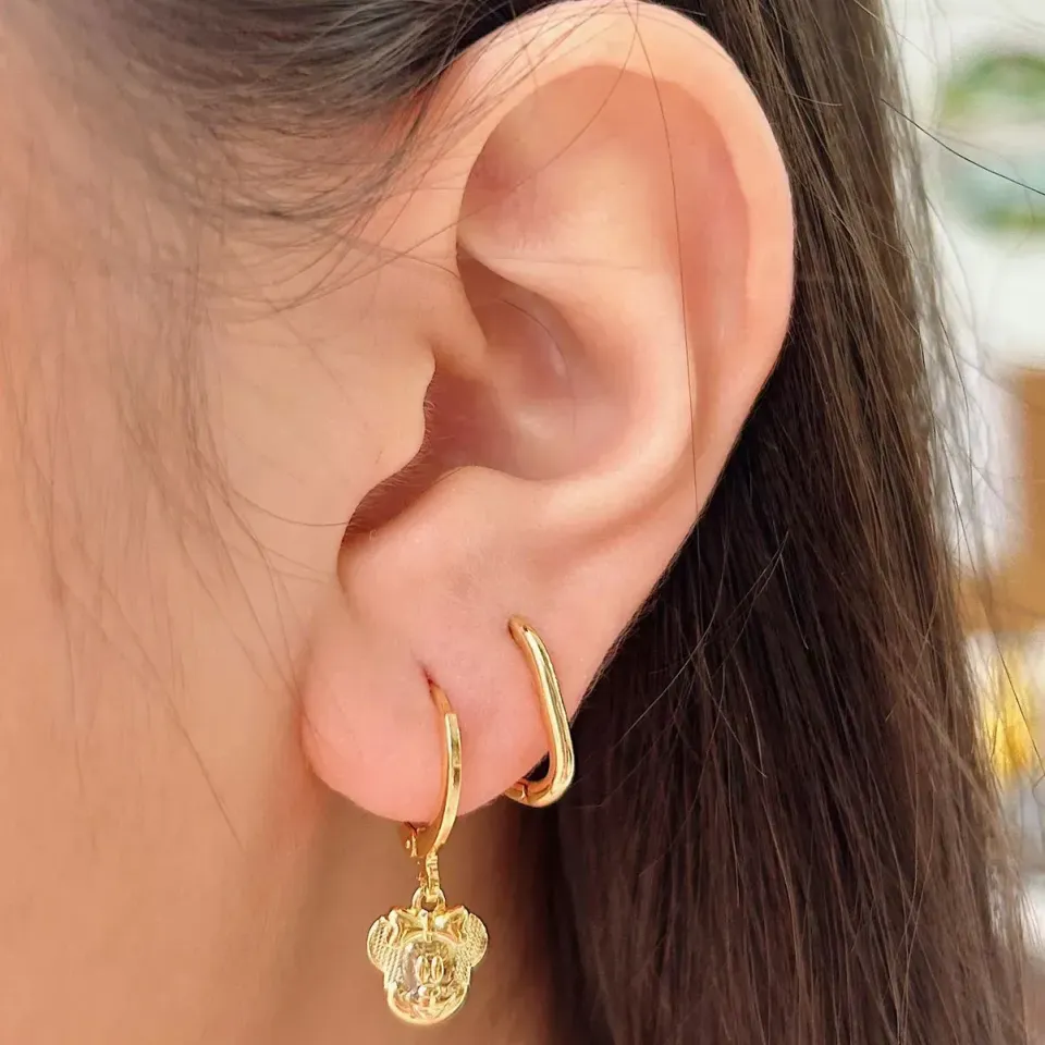 Brinco argola com pingente da minnie. banhado a ouro 18k.