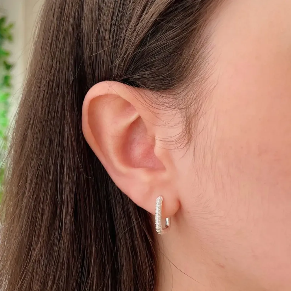 Brinco argola retangular cravejada. em prata 925.