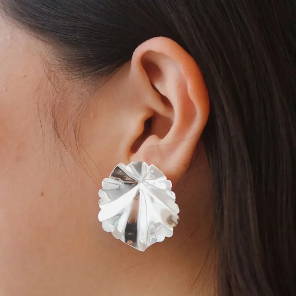 Brinco folha grande arredondada. banhado a prata.